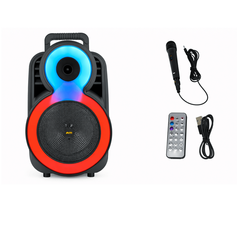 - Funciones Adicionales: Cuenta con un micrófono incluido, control de volumen con efecto de eco, y luces LED controlables.